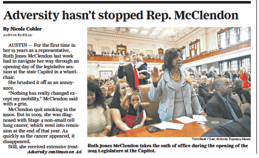 AUSTIN — For the first time in her 19 years as a representative, Ruth Jones McClendon last week had to navigate her way through an opening day of the legislative session at the state Capitol in a wheelchair.